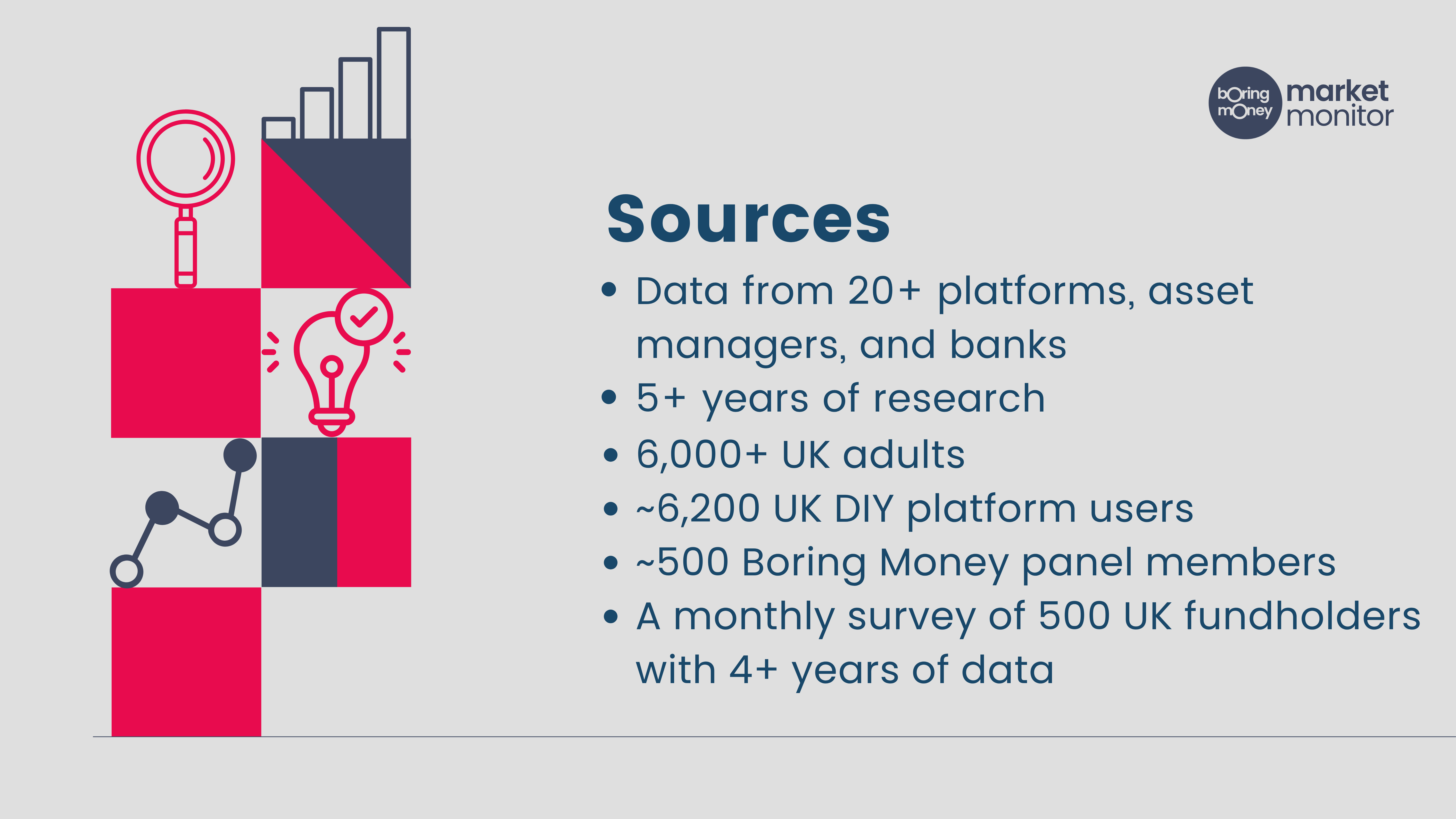 A survey of over 6,000 nationally representative UK adult, circa 6,200 UK DIY platform users, circa 500 Boring Money users, an ongoing survey of 500 fundholders per month with tracked data going back for 4+ years, and 5+ years of consumer research and market sizing conducted Boring Money