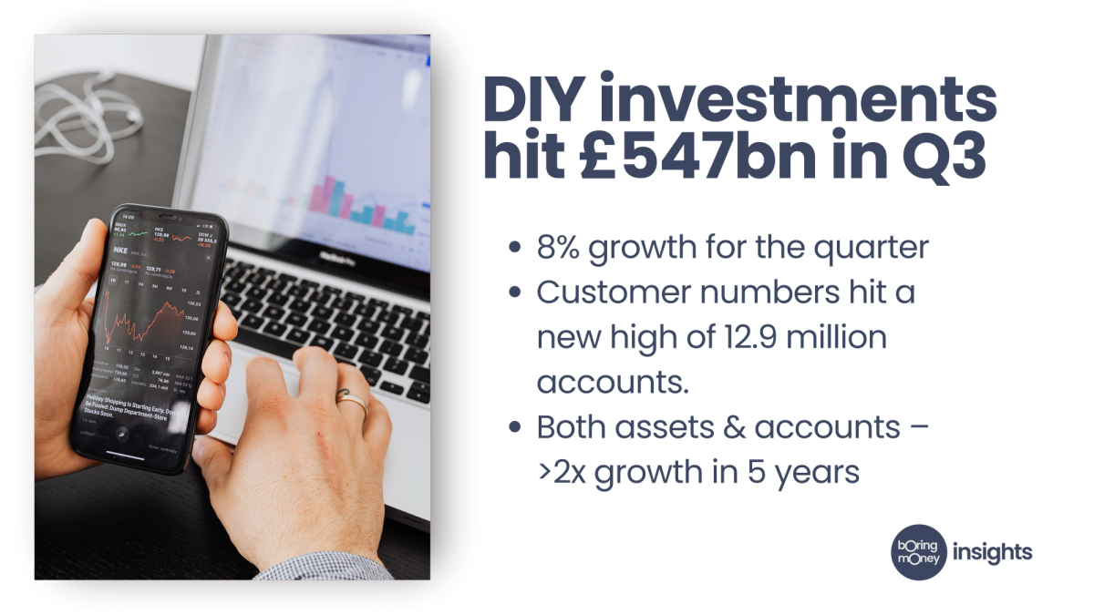 New data published today by Boring Money sizes the DIY investor market at £547 billion as at Q3 2025. Buoyant markets contributed to 8% growth in Q3 2025.